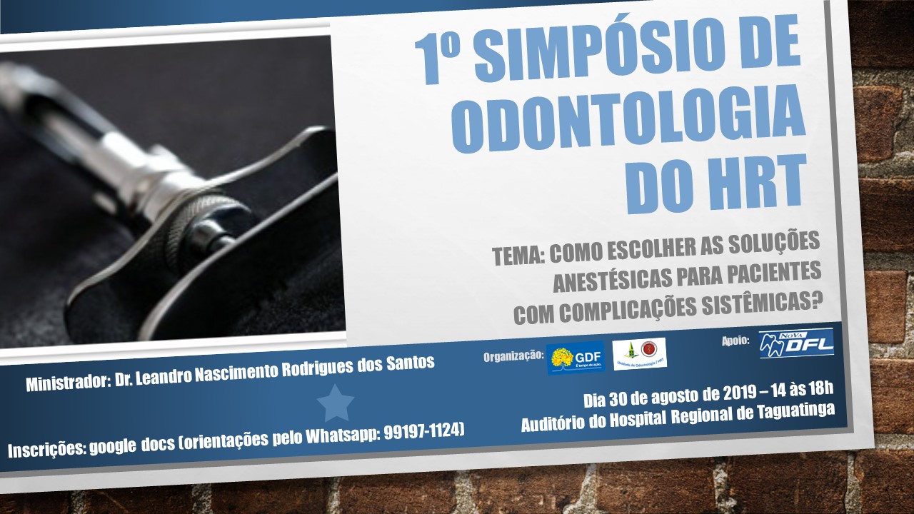 Neste mês será realizado o 1º Simpósio de Odontologia, com o tema “Como escolher as soluções anestésicas para pacientes com complicações sistêmicas?”. O evento ocorrerá no dia 30 de agosto de 2019, das 14h às 18hs, no auditório do 5º andar do Hospital Regional de Taguatinga. O certificado do evento será emitido pelo NUEP/SRSSO (Núcleo de Ensino e Pesquisa da Superintendência Regional de Saúde Sudoeste).