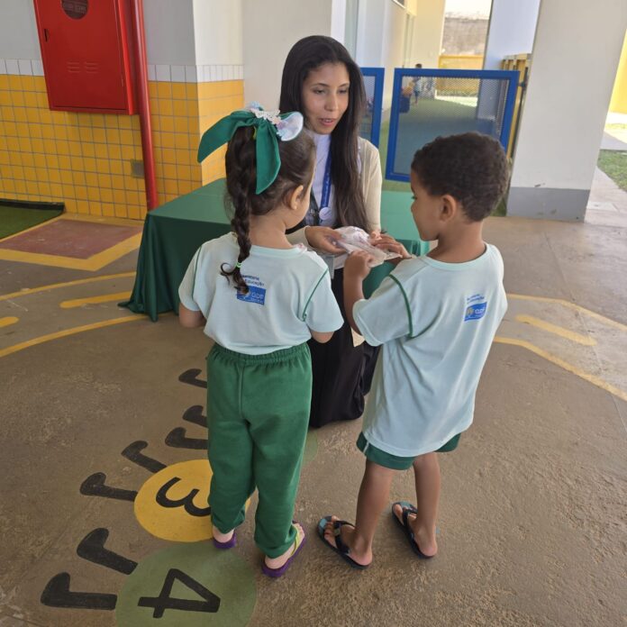 Durante a implantação da caixa de coleta, os estudantes receberam kits de higiene bucal e participaram de uma apresentação lúdica com fantoches, que abordou, de forma leve e educativa, a importância de descartar corretamente as escovas de dentes.