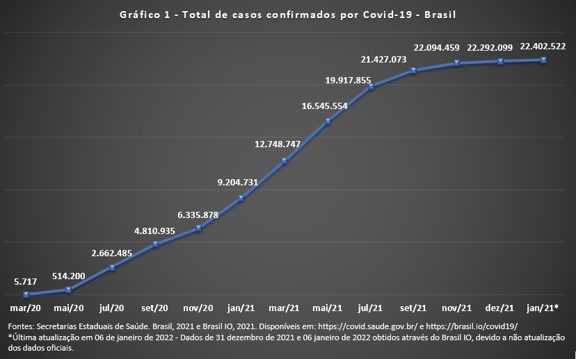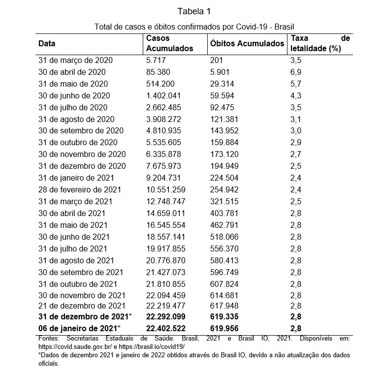 Dados atualizados do Ministério da Saúde, mostram, em 21/12/2021, um quadro com a doença instalada em todo o país: na ordem desde de março de 2020, de 22.219.477 casos confirmados e 617.948 óbitos, com 2,8% de letalidade. Por outro lado, informações recentes da mídia nacional, por meio do IO, o Brasil contabilizou em 31/12/2021 22.292.099 casos confirmados e 619.335 óbitos, passando em apenas 6 dias de janeiro de 2022 para 22.402.522 casos confirmados e 619.956 óbitos em toda a população (Tabela 1).
