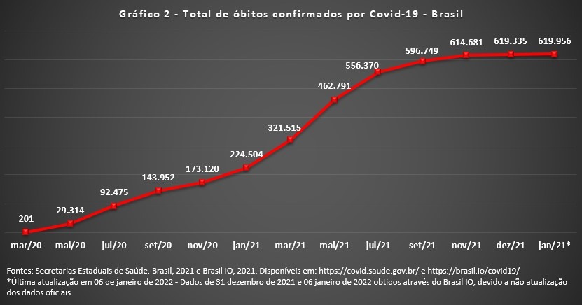 Os Gráficos 1 e 2 retratam a evolução da pandemia (atualizados e ajustados pelo Consórcio de Imprensa – IO), evidenciando que entre final de novembro de 2021 e início de janeiro de 2022, houve um aumento de 308.063 casos confirmados e 5.275 novos óbitos.