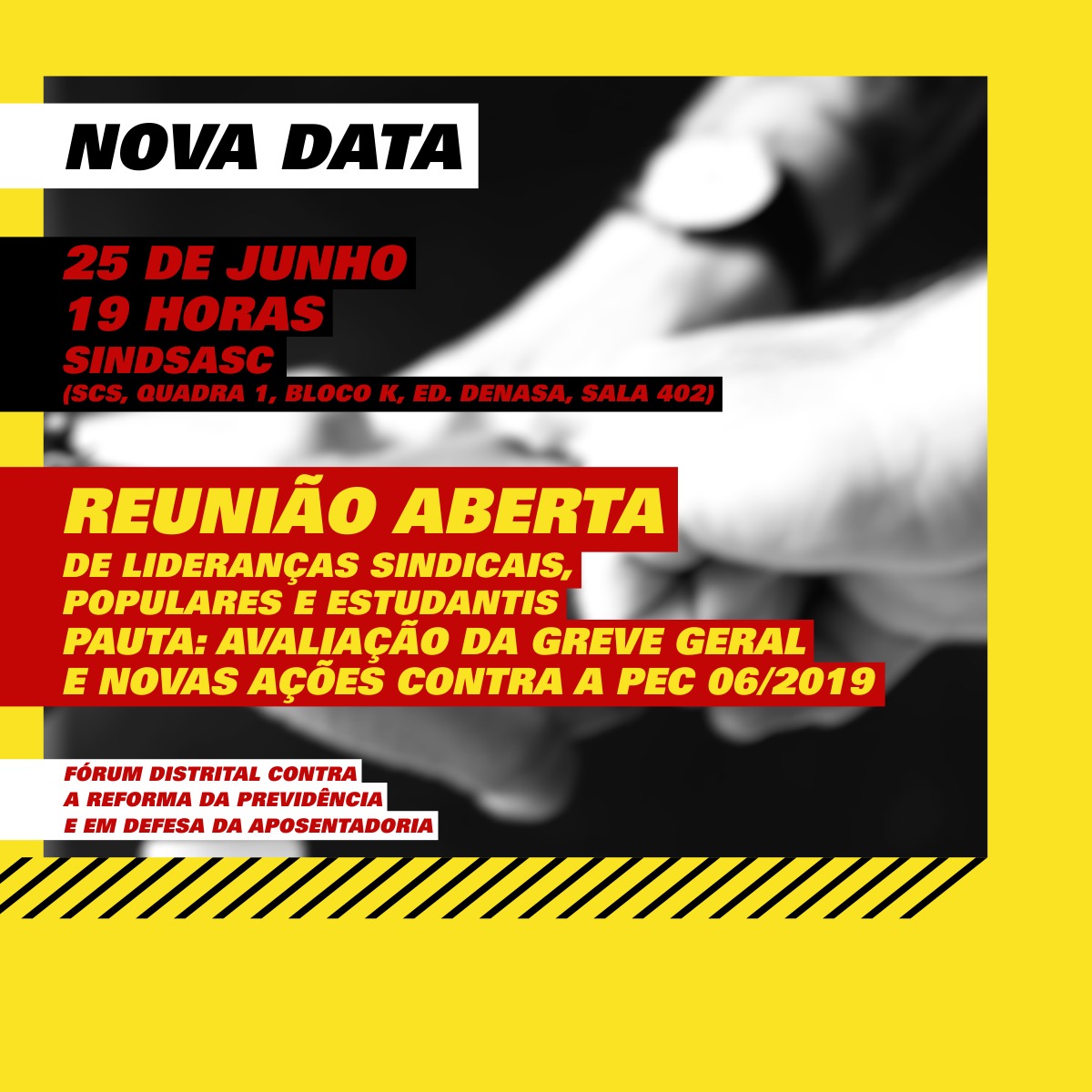 A reunião será na sede do Sindsasc (SCS, Quadra 1, Bloco K, Ed. Denasa, Sala 402), às 19 horas. A pauta propõe avaliar a Greve Geral de 14 de junho e debater sobre novas ações contra a PEC 06/2019.