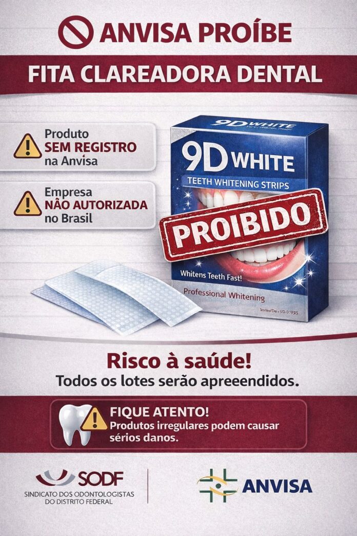 A Agência Nacional de Vigilância Sanitária (Anvisa) proibiu a comercialização, distribuição, importação, propaganda, transporte e uso da fita 9D White Teeth Whitening Strips, produto utilizado para clareamento dental. A decisão foi publicada na terça-feira (27) no Diário Oficial da União (DOU).