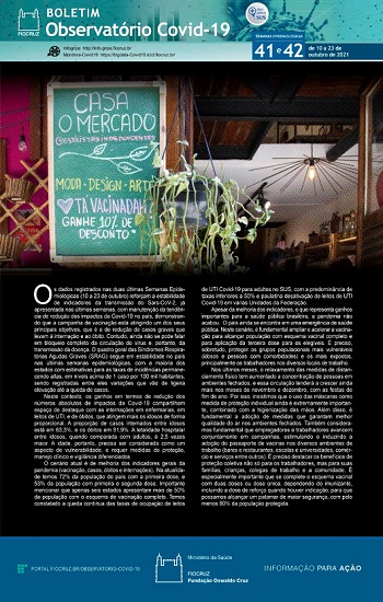 O quadro geral aponta que os resultados observados nas duas últimas semanas epidemiológicas (10 a 23 de outubro) reforçam a manutenção da tendência de redução dos impactos da Covid-19 no país, demonstrando que a campanha de vacinação está atingindo um dos seus principais objetivos – o de redução de casos graves que levam à internação e ao óbito. Contudo, os pesquisadores alertam que ainda não se pode falar em bloqueio completo da circulação do vírus e, portanto, da transmissão da doença.