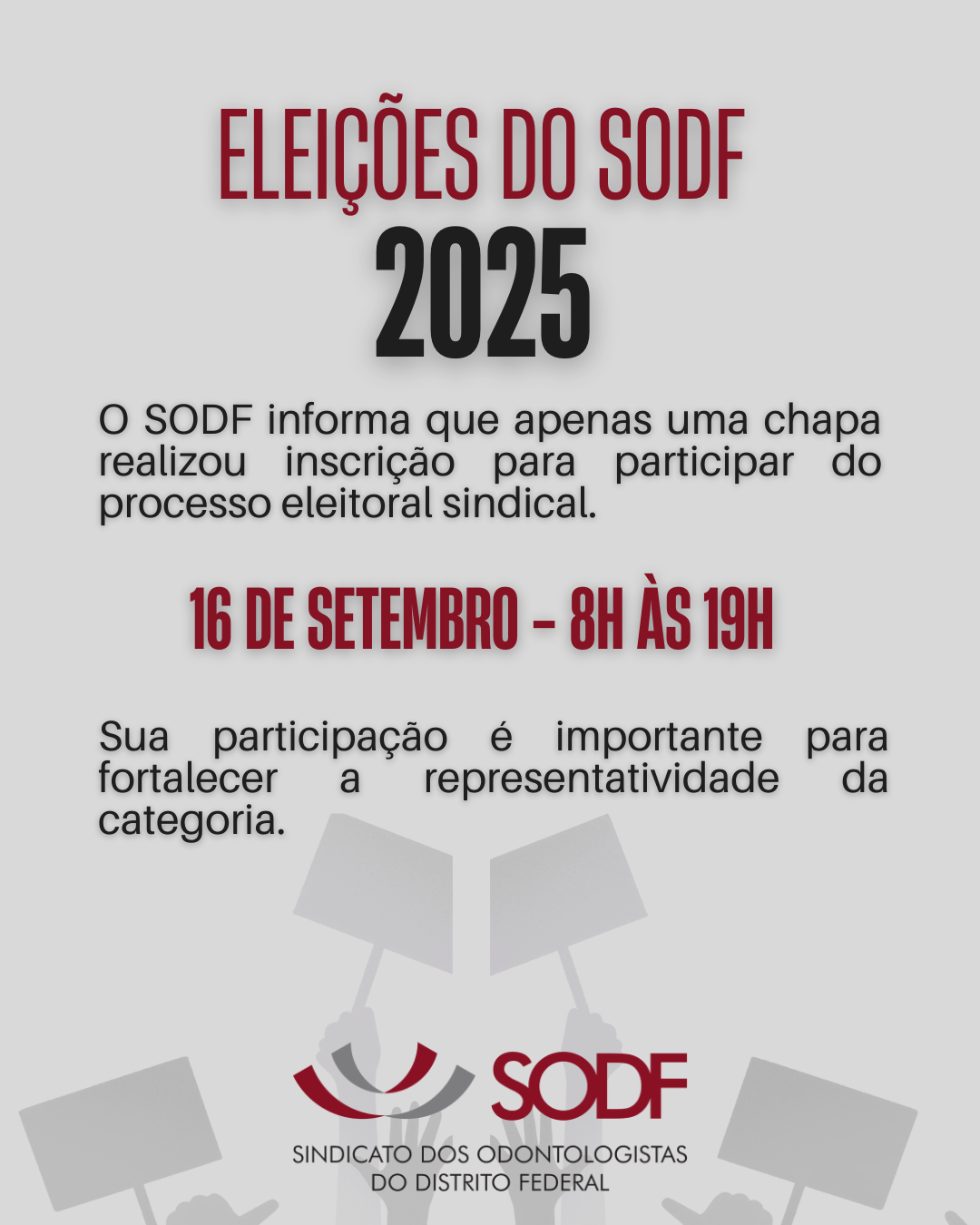 O Sindicato dos Odontologistas do Distrito Federal (SODF) informa que apenas uma chapa foi inscrita para as Eleições Sindicais de 2025: FORÇA, LUTA E RENOVAÇÃO.