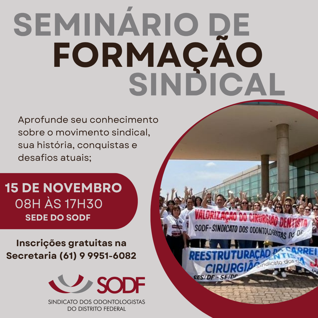 É com grande satisfação que o Sindicato dos Odontologistas do Distrito Federal (SODF) convida todos os cirurgiões-dentistas para participar do I Seminário de Formação Sindical — um encontro voltado à reflexão, aprendizado e fortalecimento da nossa categoria.