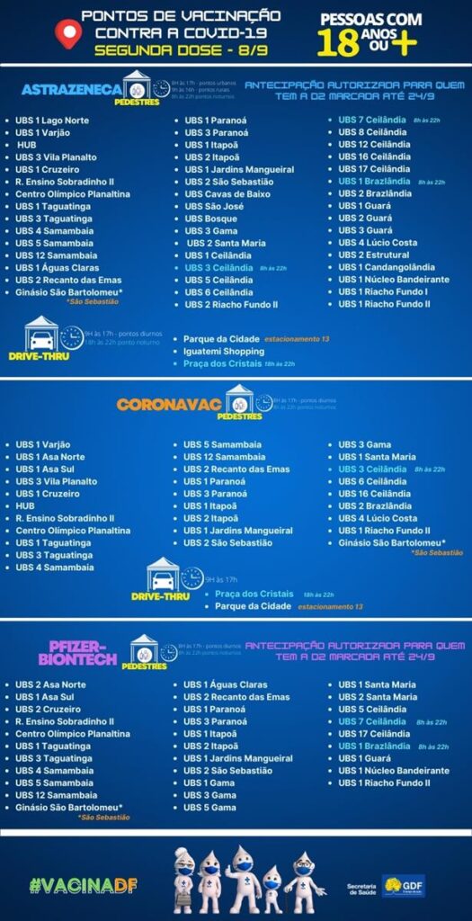 O DF amanheceu com filas nos postos de vacinação nesta quarta-feira (8/9), quando a Secretaria de Saúde inicia a antecipação da segunda dose para quem teve o agendamento da D2 programado para até 24 de setembro. Os pontos de imunização aplicam o reforço em quem recebeu vacinas contra Covid-19 da AstraZeneca ou da Pfizer na D1.