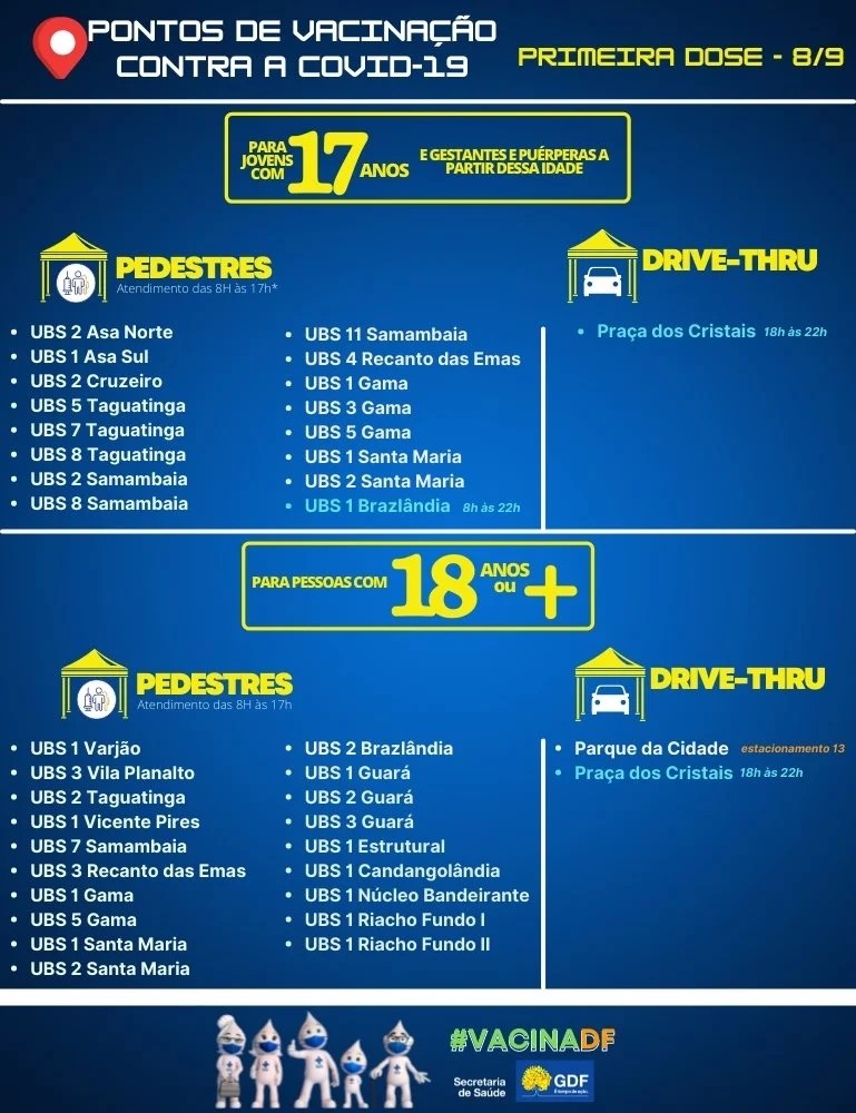 A Secretaria de Saúde do Distrito Federal atualizou as informações sobre os locais de vacinação contra a Covid-19 desta quarta-feira (8/9) e incluiu o Parque da Cidade. Até as 10h, o site da pasta não mostrava o Parque como um dos pontos de aplicação de primeira e segunda dose no DF hoje.