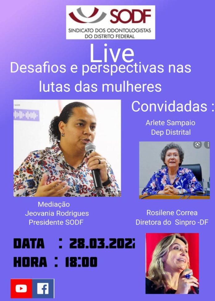 Notícias Live !!! Desafios e Perspectivas nas lutas das Mulheres. Por Ascom SODF - 24 de março de 2022 342 Compartilhar no Facebook Tweet Acompanhe nos links abaixo! https://www.facebook.com/events/501425294820229