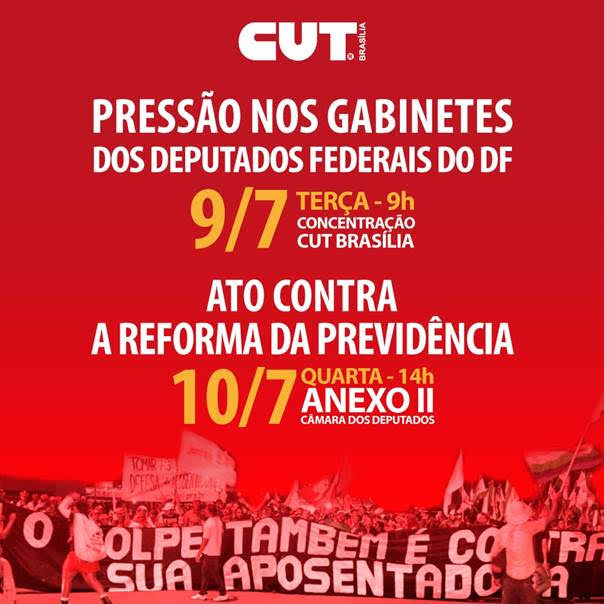A Reforma da Previdência está na iminência de ser aprovada na Câmara dos Deputados, sendo este um momento crítico a classe trabalhadora. O Sindicato dos Odontologistas do DF manifesta total apoio ao Ato Contra a Reforma da Previdência, convocado pela Central Única dos Trabalhadores (CUT), marcado para amanhã, dia 10/07, às 14h no Anexo II da Câmara dos Deputados, em Brasília/DF.
